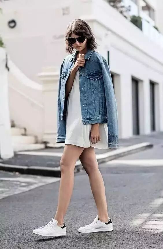牛仔外套内搭小白裙,脚上搭双白色运动鞋,很清新又休闲百搭。