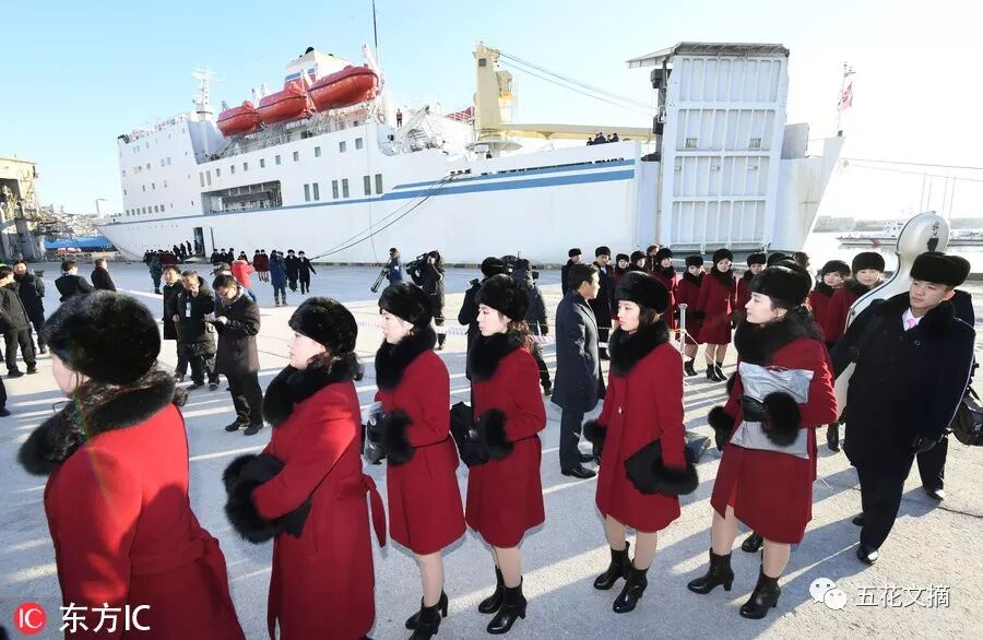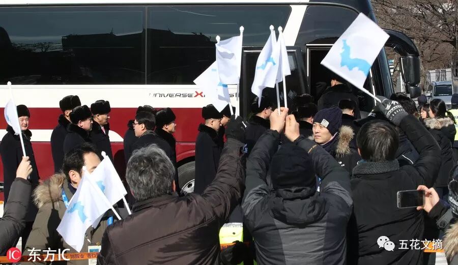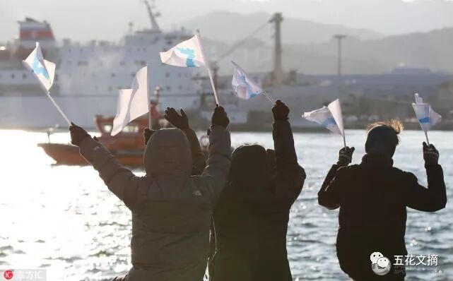 2月6日,朝鲜艺术团抵达韩国江原道,韩国民众在岸边挥舞半岛旗迎接。