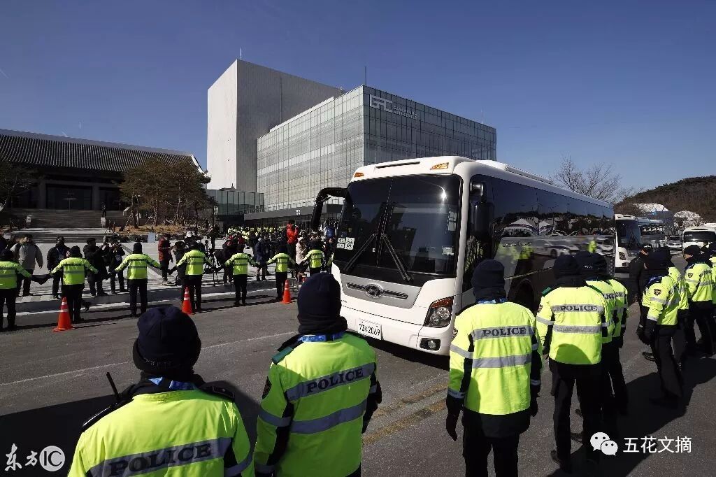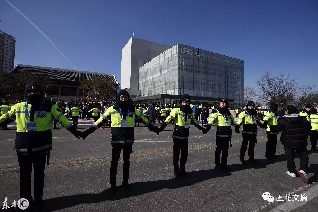 在外面等候的韩国民众举起半岛旗欢迎拉拉队
