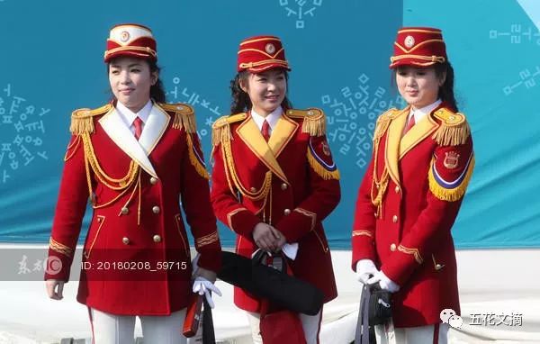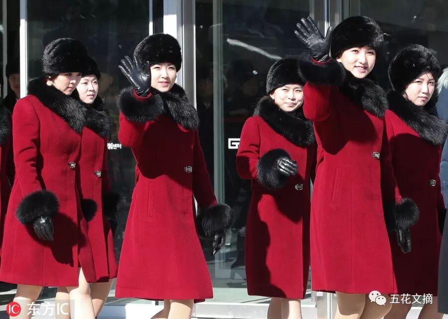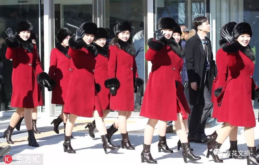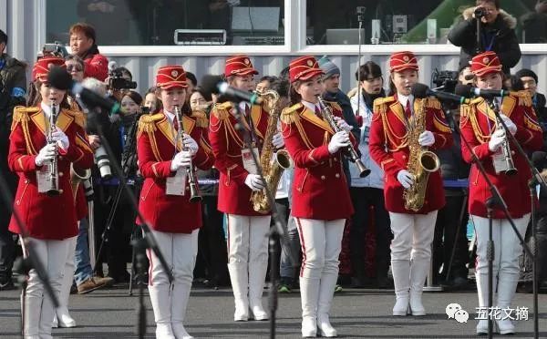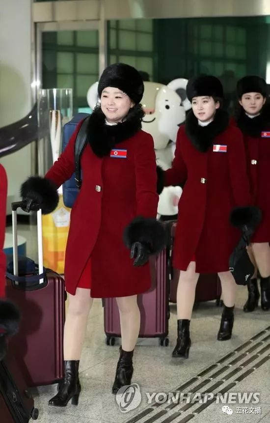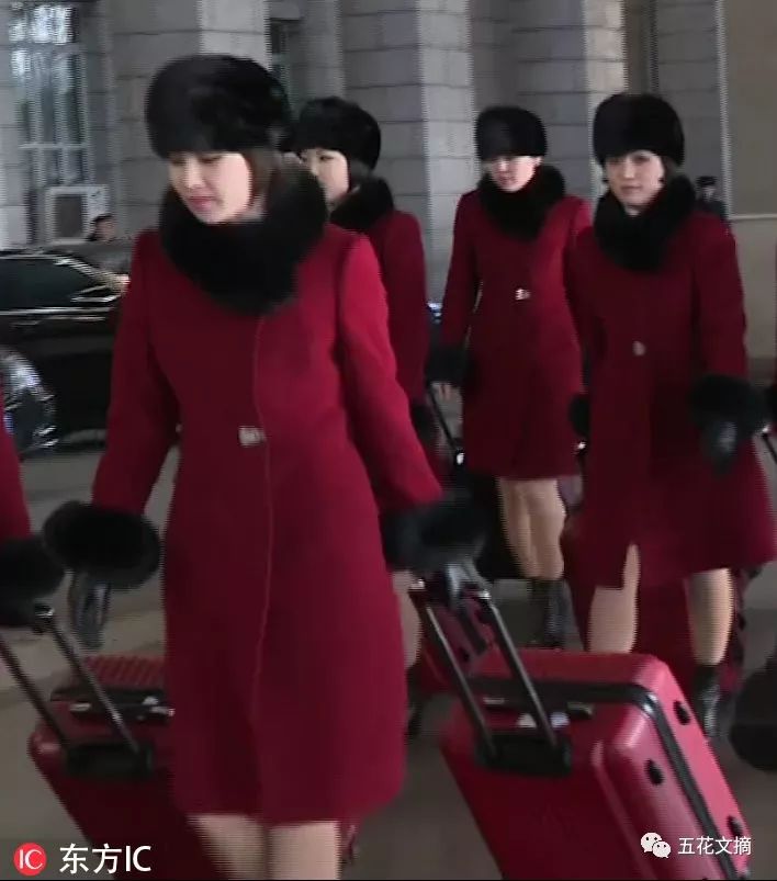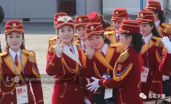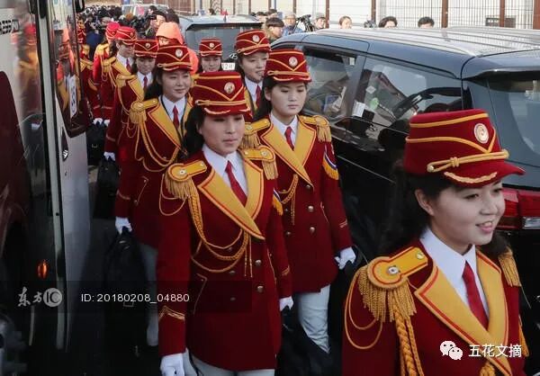 拉拉队员个个青春靓丽,颜值爆表,身穿统一的,有朝鲜国旗的红色呢子大衣,平均身高1米65,面带微笑,韩媒大赞“太美了”,韩国警方为她们提供了“超国宾安保待遇”。