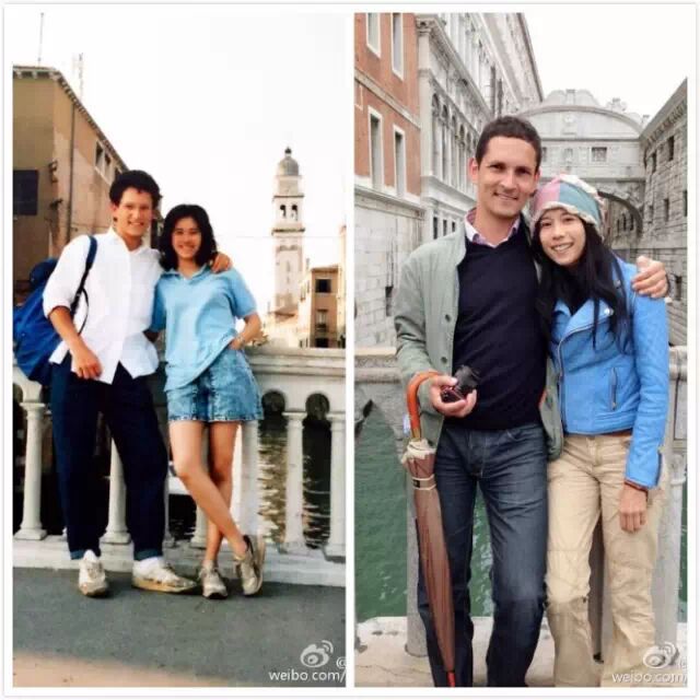 莫文蔚与老公Johannes相识相恋在1987年的意大利,那时他们17岁。莫文蔚说:“当年就是那种纯纯的Puppy Love。”分手后,两人走上不同人生道路:Johannes有过一段失败的婚姻以及三个子女,在金融行业担任高管;莫文蔚凭借混血儿的独特风格和独特嗓音,成为影视歌三栖天后。兜兜转转30多年,2011年莫文蔚在台湾金曲奖颁奖礼上说:“我们会在年底在意大利完婚”,生命的缘分就是如此奇妙。41岁的他们再次故地重游,在同一个地方拍下这张照片。