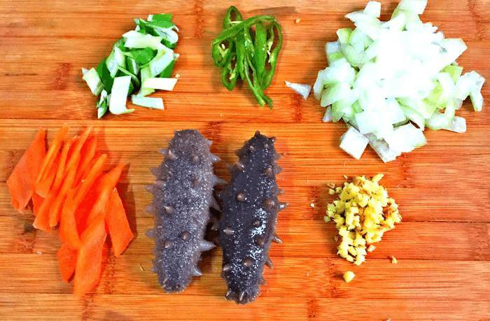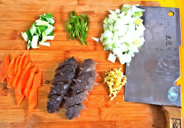 海参切斜段,姜切末、圆葱切丁,胡萝卜切斜片,尖椒切丝,葱切葱花待用