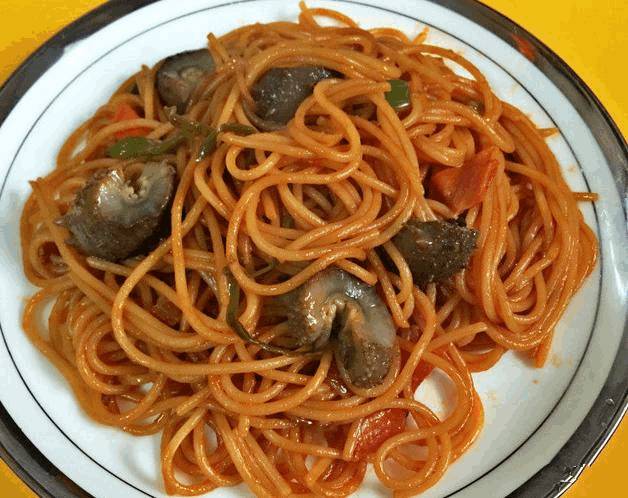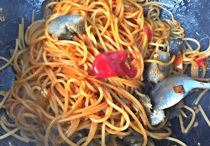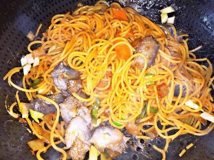 此时改大火将面与宫品海参一起倒入锅中翻炒,后加入番茄酱继续翻炒