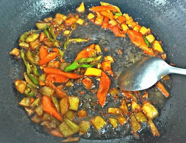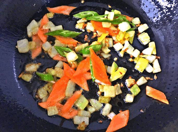 锅内加油,油温8成热时加姜末爆香放洋葱丁、胡萝卜、青椒丝翻炒后加人料酒、胡椒粉、海鲜酱油、蚝油中火熬制一分钟