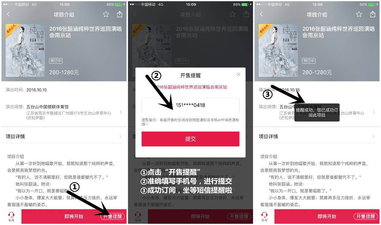 成功订阅之后,在正式开售前会第一时间收到短息提醒,让你随时随地虏获张韶涵
