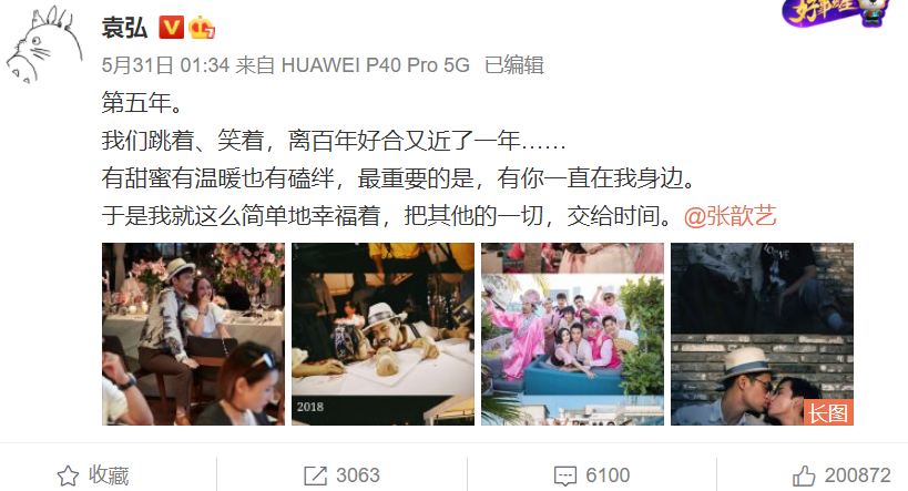 前段时间,两人结婚纪念日,袁弘在微博上写道: