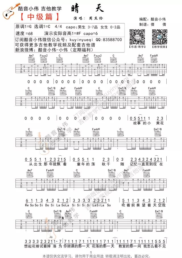 每日一曲 《晴天》-周杰伦 ~By 酷音小伟 港台男星 2016-05-01 18:30:28 128 创作不易,用心坚持,欢迎请BaGua喝几杯爱心咖啡!打赏并支持本文 打赏并删除本文 晴天故事的小黄花 从出生那年就飘着童年的荡秋千随记忆一直晃到现在《晴天》是周杰伦填词、谱曲并演唱的歌曲名称,所属专辑:《叶惠美》。2003年,《晴天》荣获第十届全球华语音乐榜港台地区最佳歌曲奖,2005年获第四届全球华语歌曲排行榜年度最受欢迎金曲奖。晴天一首偏校园怀旧风的Britpop歌曲。每逢听到这首歌就会想到你的校园、你暗恋的对象、青涩的天真和单纯的永恒。《晴天》对那个年代的人的意义就是“校园一股清风,情窦的永恒。”整首歌词简单但直接,说它简单是它没有林夕文山的那么有深意,说它直接其实就是周杰伦的内心独白,就好比周杰伦拍《不能说的秘密》一样,全部都是周杰伦的内心想法,他想通过写歌、电影来表达自己,实现自己曾经没有实现的东西。MV来自酷音小伟吉他的扒谱~这是中级的原版编排,另外有初级简单编排可在网站找哦~谱点击下方“阅读原文”可进入视频教学~↓↓↓微信号:jitashenet吉他社永远年轻 永远热爱音乐 创作不易,用心坚持,欢迎请BaGua喝几杯爱心咖啡!打赏并支持本文 打赏并删除本文 感谢您的支持鼓励,我会继续努力的!文章地址:用户邮箱:打赏金额:USDT 请输入数字点击”去打赏“,即可进行打赏支持本文章哦 周杰伦 发表评论