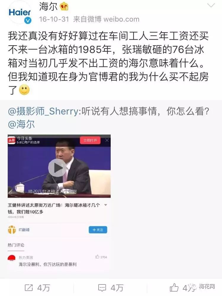 @海尔君:实际上我们回应的不是王健林,是粉丝。在这个事情之前,就有很多官微跟着我们玩,这个事情之后,当然依然有很多官微跟着我们玩。跟我们玩的原因是粉丝喜欢啊,商量不商量都没啥意义。