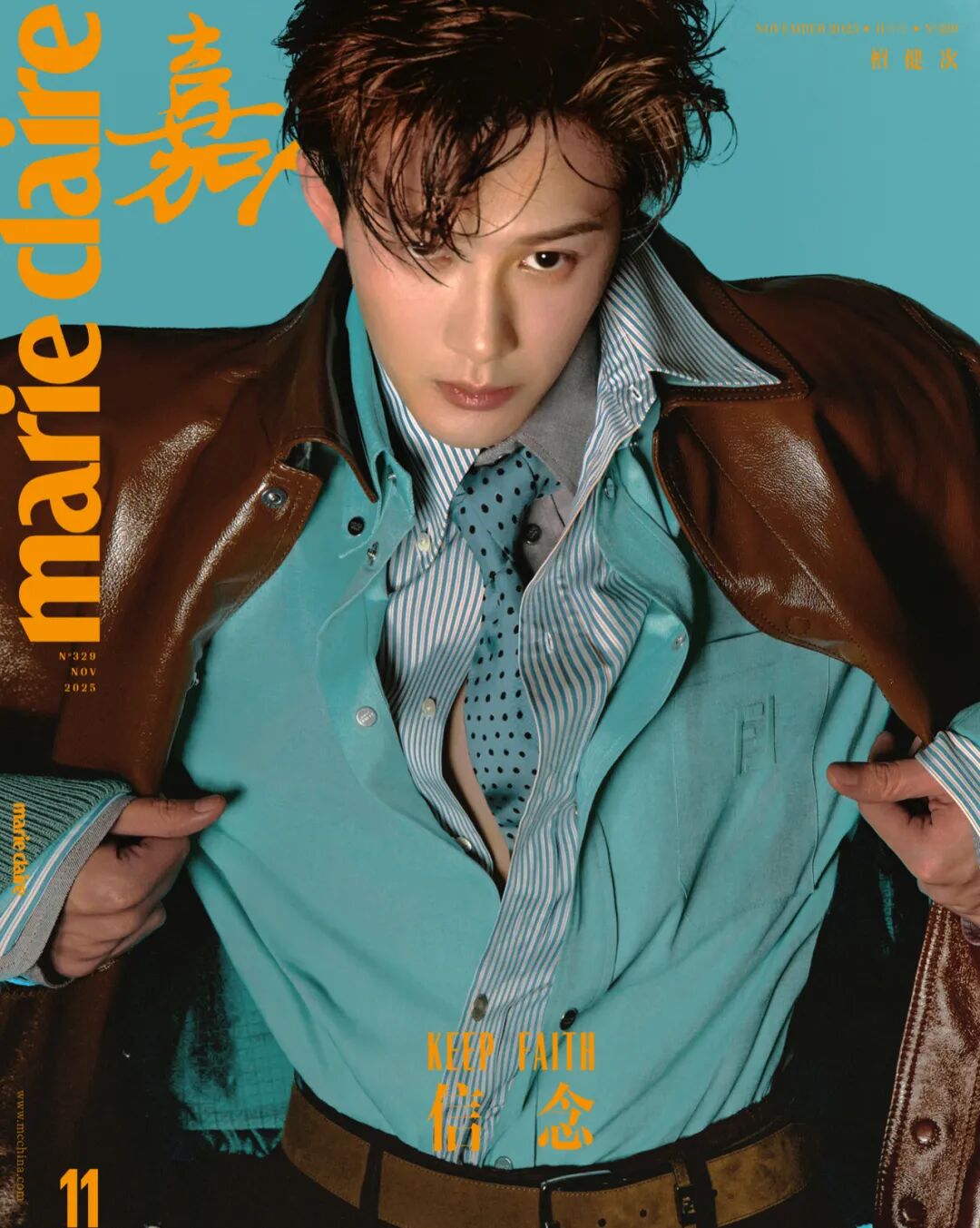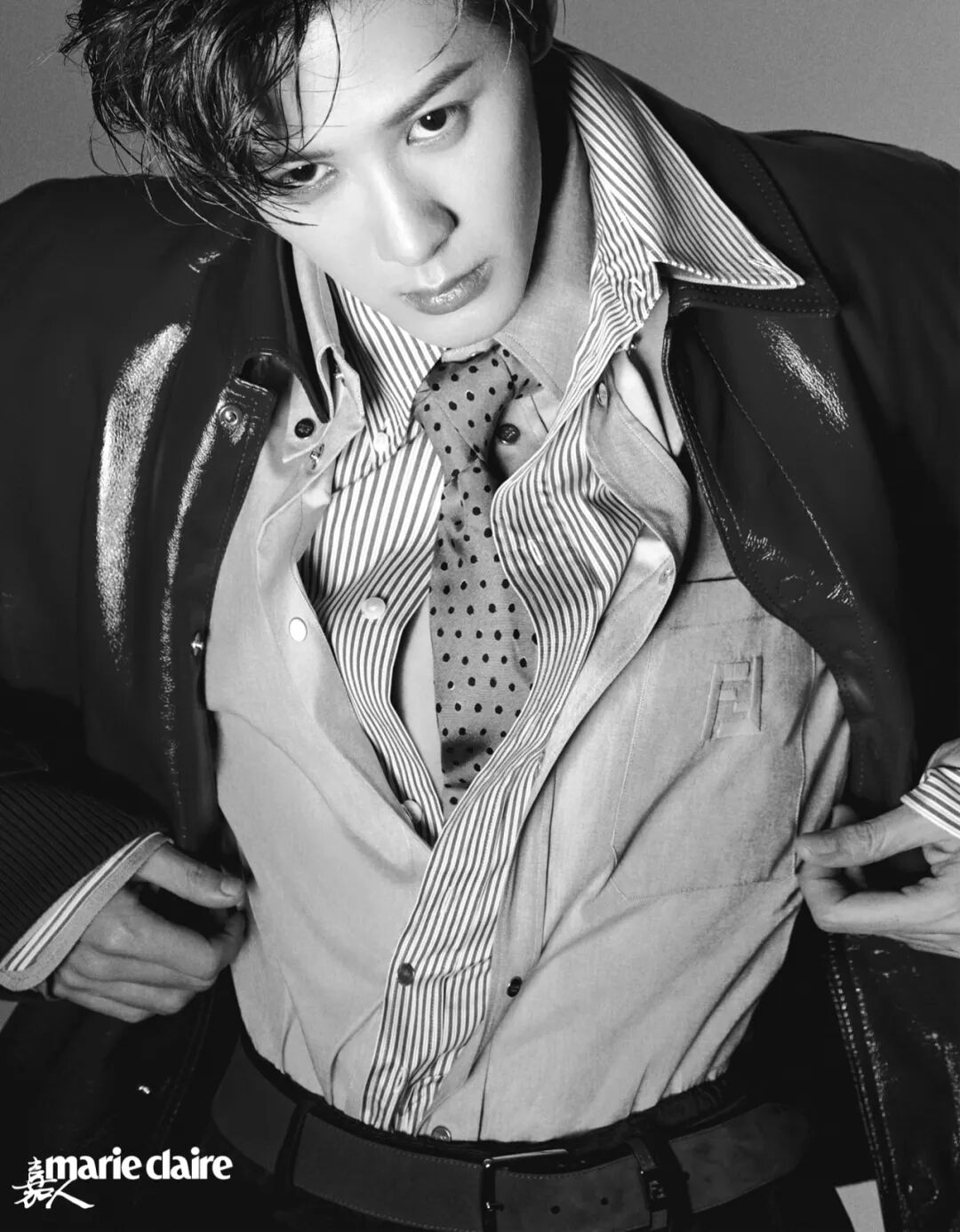 蓝色波点领带、棕色皮革腰带 均为FENDI