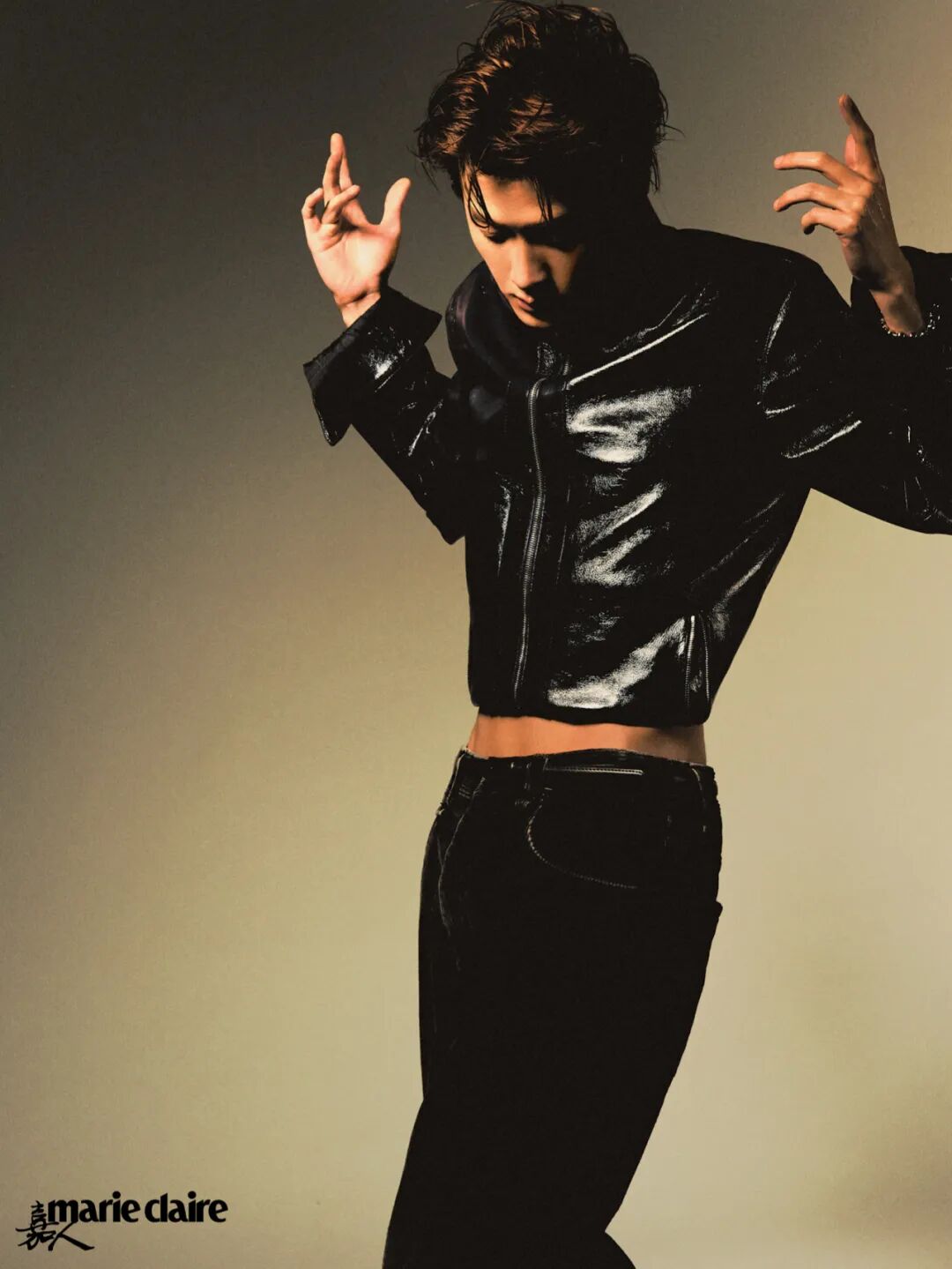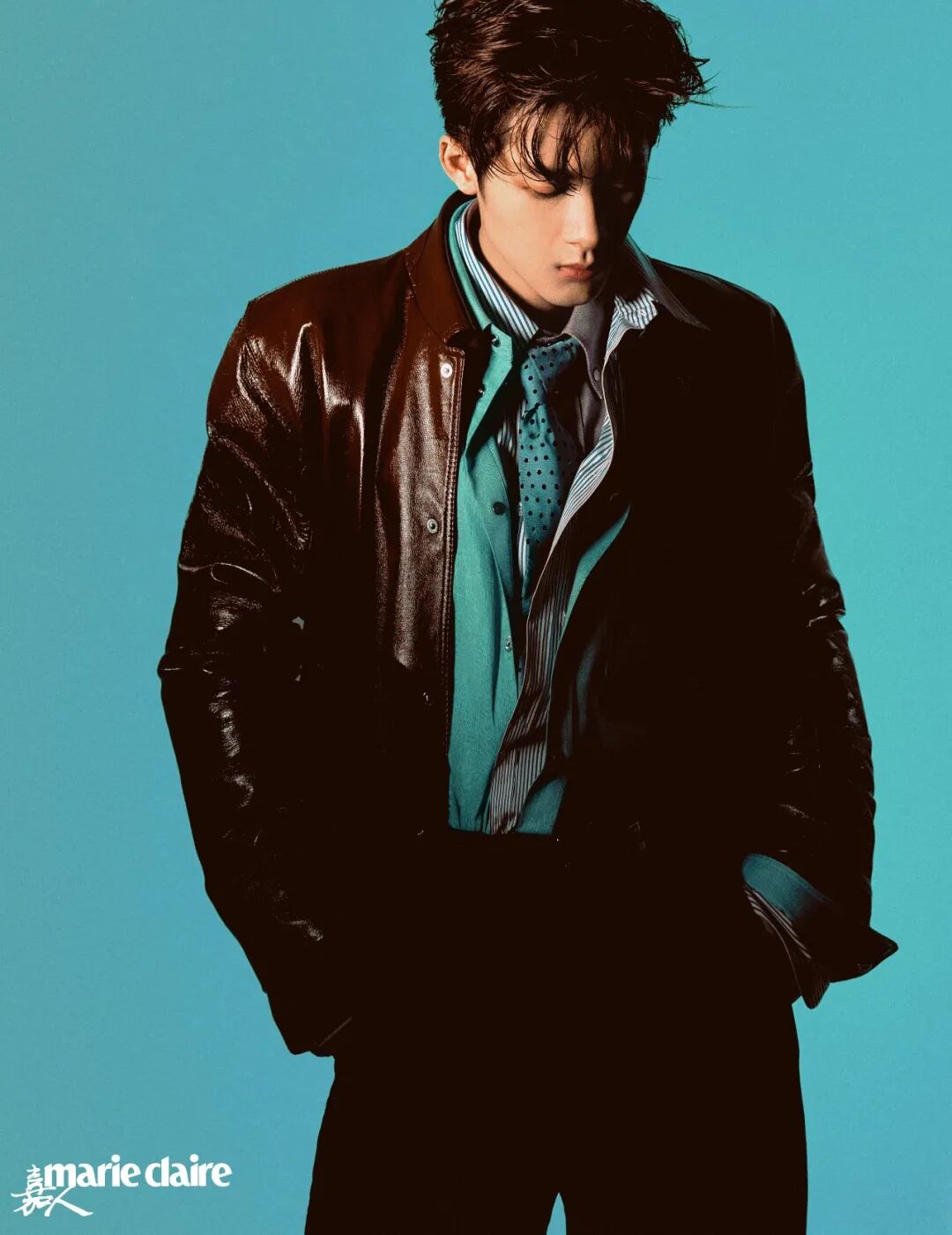 棕色亮面皮夹克、浅蓝色棉质衬衫