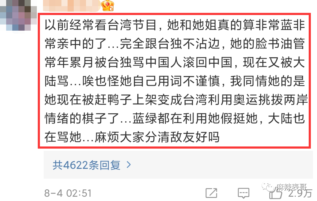 小S三番五次挑热度,如今一言不发,是烦+怂;大S嘴上说着体体面面,但直接提告又通报给媒体,是两面三刀。卤蛋在背后,毫无用武之地,是软饭+无用。