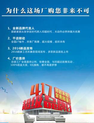 2016年3月8日,在2016年顾家工艺沙发新品发布会暨财富大会上,顾家家居副总裁刘宏透露,今年4月,邓超将接力张学友,成为顾家家居新代言人。4月17日,顾家超级品牌日,邓超将以“顾家好男人”的全新形象正式成为顾家品牌形象代言人。