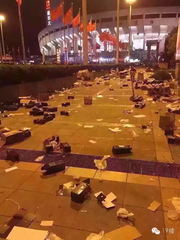 不过,在随后的微博、微信朋友圈上,一张照片被频频转发——有网友拍摄下观众离场后的黄龙体育中心,地面上包装盒、纸箱、塑料袋、纸巾随处都是,远处,几名负责清扫的工作人员正在打扫中。