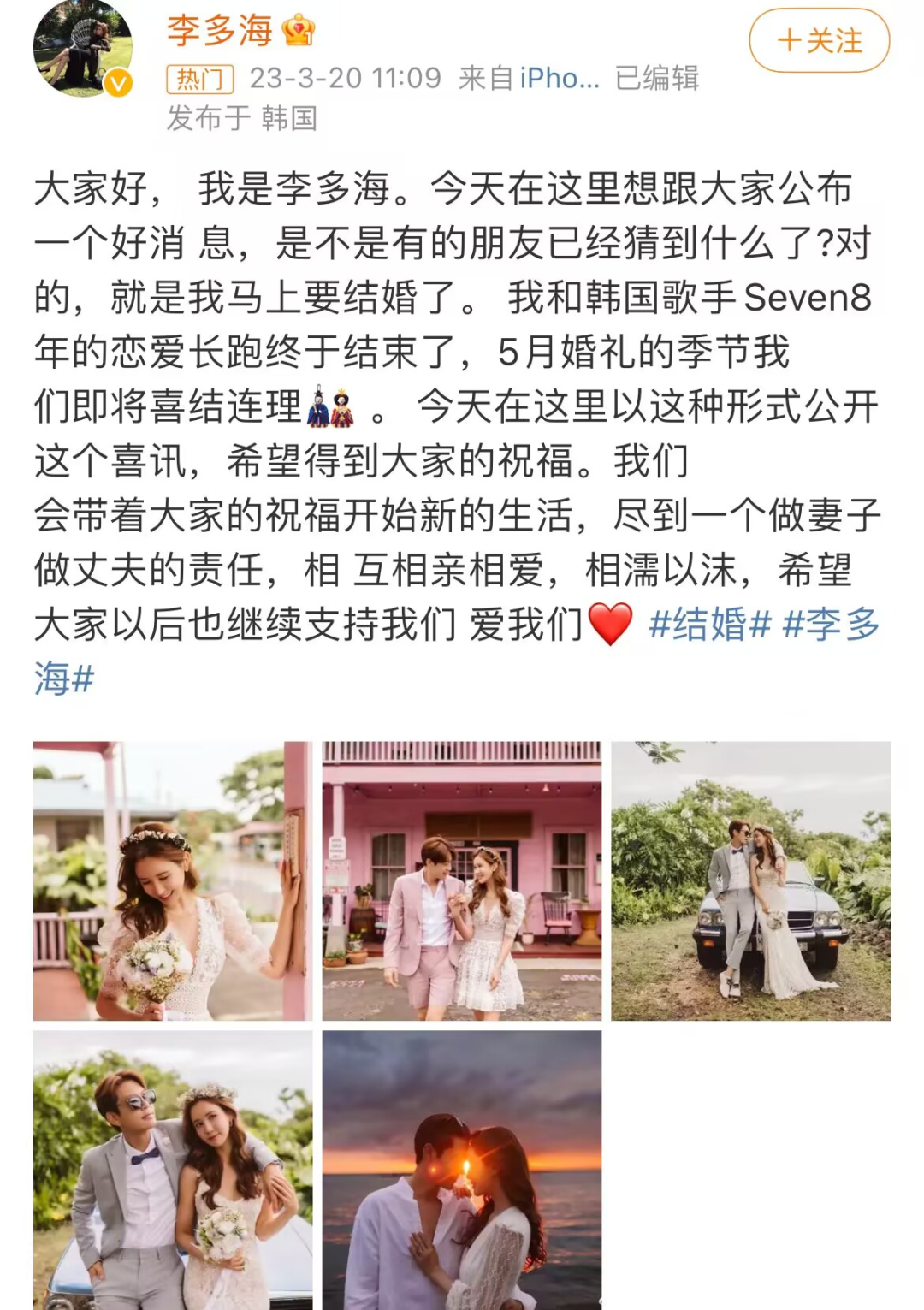 20日,泡菜国女星李多海在微博发帖,称自己和男星seven结束了8年的恋爱长跑,即将结婚,并且婚礼还会在5月份举办,就此上了一波热搜。