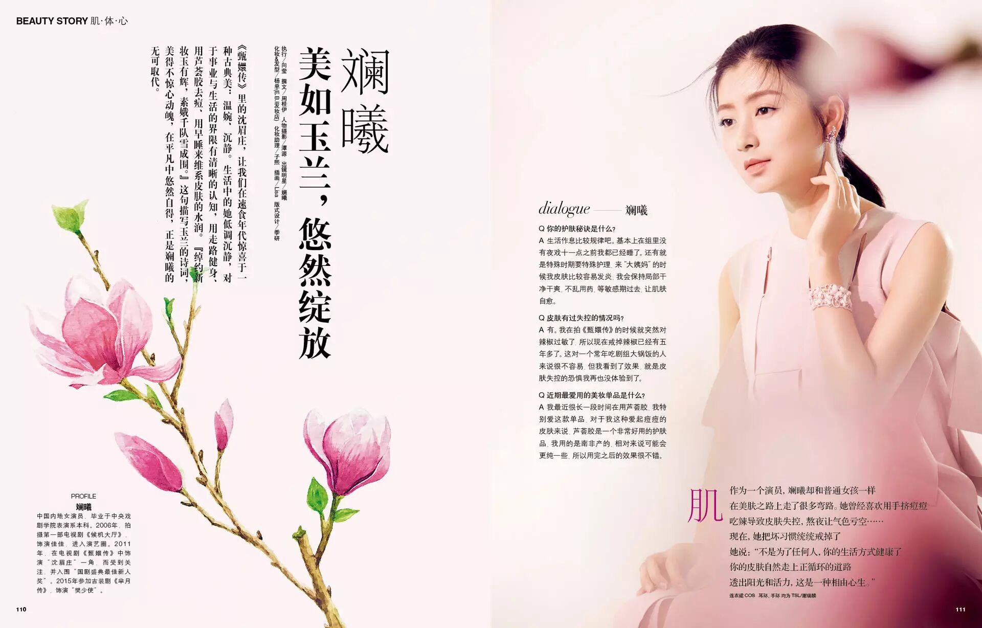 《甄嬛传》里的沈眉庄,让我们在速食年代惊喜于一种古典美:温婉、沉静。生活中的她低调沉静,对于事业与生活的界限有清晰的认知,用走路健身、用芦荟胶去痘、用早睡来维系皮肤的水润。 『绰约新妆玉有辉,素娥千队雪成围。』这句描写玉兰的诗词,美得不惊心动魄,在平凡中悠然自得,正是斓曦的无可取代。