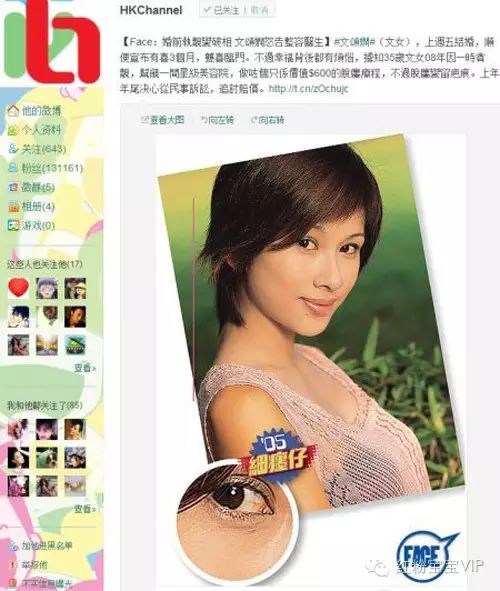 据说文颂娴2008年因为贪靓,在香港一个护肤中心做了价值600美元的小手术,去除右下方的一粒小痣。谁知这个并不复杂的手术令文颂娴的右眼下方留下了一道长条状疤痕,即使化上很浓的妆也清晰可见。