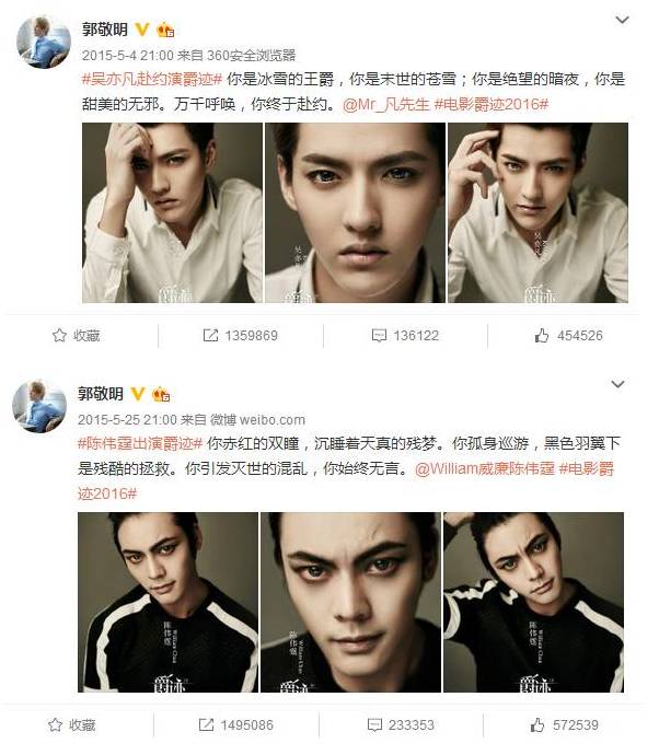 《爵迹》里,郭敬明请来王源、陈学冬、吴亦凡、陈伟霆、范冰冰等“当红炸子鸡”担任主演。