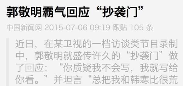 有这样抄袭黑历史的郭敬明,不仅在公众面前高傲的抬起头说自己绝不道歉,还被社会奉为“成功人士”。