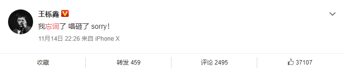 14日晚王栎鑫在微博上发文承认此事并道歉:“我忘词了,唱砸了,sorry!”