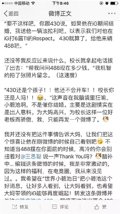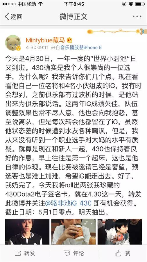 北京时间4月30日IG俱乐部副总裁藏马发微博称今天是4月30日,一年一度的“世界小碧池”日。 “小碧池”就是藏马在微博中所说的IGdota部的430。