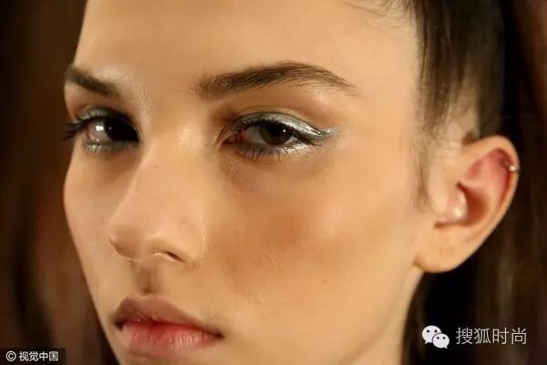 而在Marissa Webb的秀场上,设计师为模特儿们选择的是简单的大地色裸妆搭配炫亮的银色眼线,大地色眼影加深眼部轮廓,银色眼线冷酷硬朗,足够打造出简洁又时髦科技未来感。