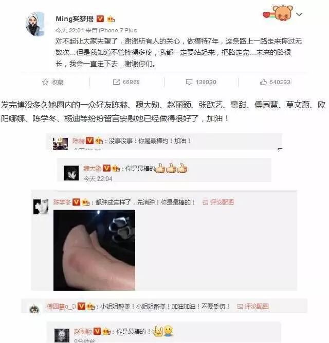 随后,奚梦瑶亲自发博回应此事:对不起让大家失望了,做模特7年,这条路上一路走来摔过无数次,但我知道不管摔得多疼,我都一定要站起来,把路走完,谢谢你们! 发完博没多久她圈内的一众好友陈赫、魏大勋、赵丽颖、张歆艺、景甜、傅园慧、莫文蔚、欧阳娜娜、陈学冬、杨迪等纷纷留言安慰她已经做得很好了,加油!