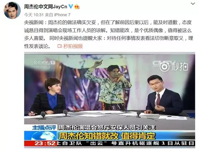 但周杰伦本人承认自己犯错了,演唱会结束后,周杰伦为自己的行为感到抱歉,并专门录制视频进行道歉。
