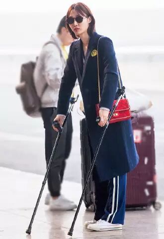 白百何还真是劳模,脚伤还没完全好就拄着拐杖现身机场,这也是她脚伤后首次复工,身穿黑色长外套配运动风廓形长裤,脚踩白色运动鞋,典型的Normcore风格啊!