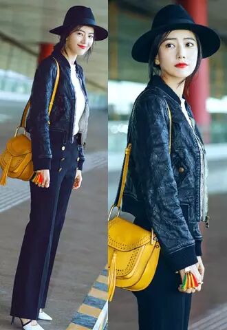 另外一套机场造型,黑色短皮夹克配直筒裤装,头戴黑色宽檐礼帽造型利落帅气,大红唇衬得她肌如白雪!