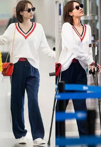白百何又高又瘦,脱去外面的黑色长外套,里面是mo&co白色大V领针织毛衫,肩背chanel红色包包亮相首都机场,包包也好美穿上mo&co上衣完美的演绎了青春活力、配上chanel红色麂皮链条包包又不乏成熟女人的魅力。