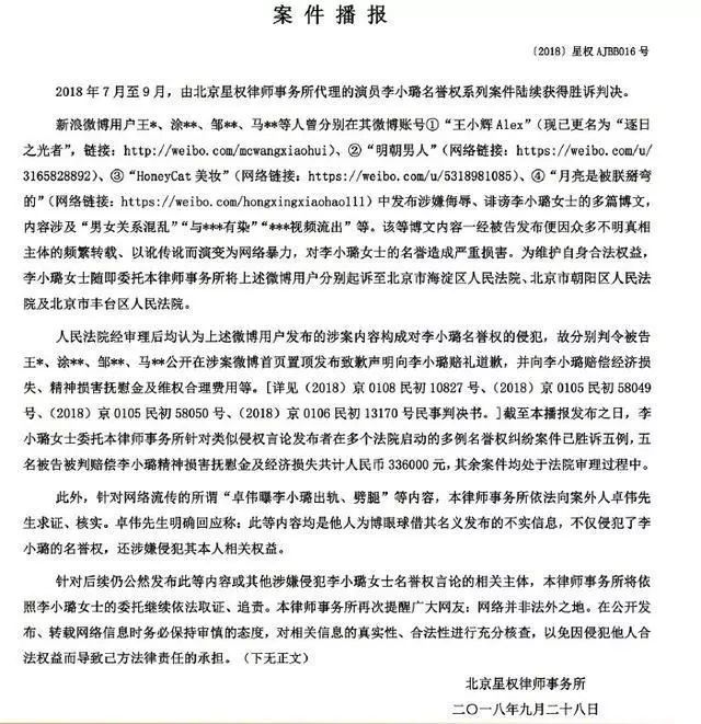 28日,北京星权律师事务所发布案件播报,称其代理的演员李小璐名誉权胜诉。有相关媒体就此事采访了律师事务所主任,他表示,目前在已经启动诉讼的20余起李小璐名誉权案件当中,共有五起案件下发判决,最新一起胜诉案件于27日宣判,5例已下发判决案件均以李小璐方胜诉告终。