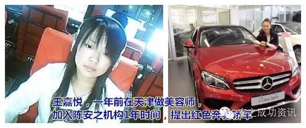4.王嘉悦,一年前在天津做美容一个月3000元,加入陈安之机构领众集团1年,买出自己喜欢的红色奔驰轿车。