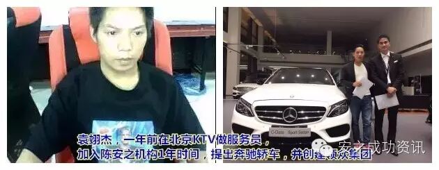 1.袁翊杰,一年前在北京KTV刷马桶,加入陈安之机构1年后创建领众集团,拥有自己的奔驰E260。