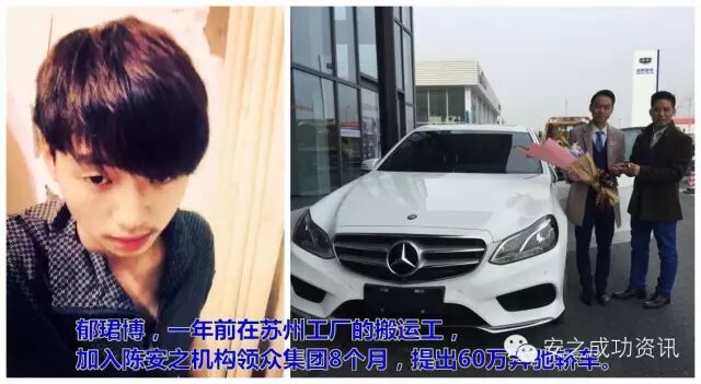2.郁珺博,一年前在苏州工厂做搬运工,加入陈安之机构领众集团1年拥有自己的价值60万的奔驰。
