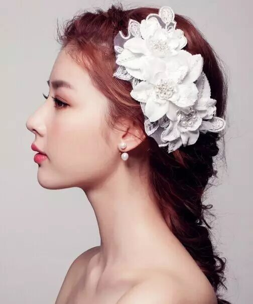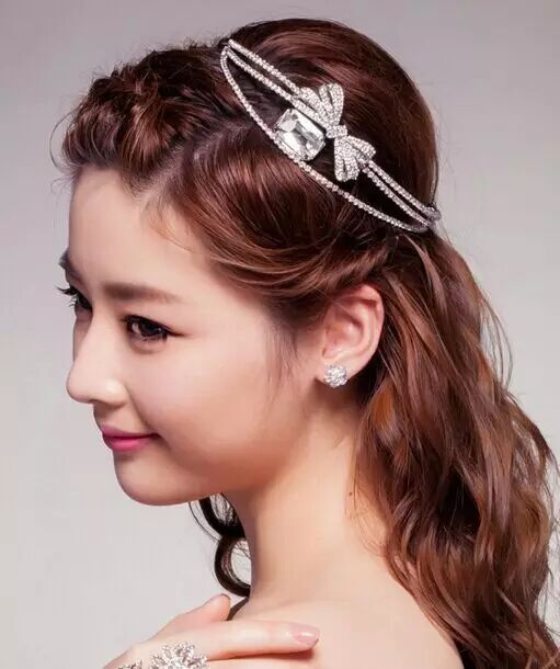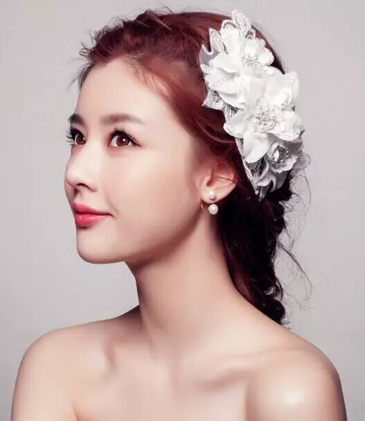 发型五:现在很多新娘子都喜欢在结婚当天选择披发,韩式的新娘发型也有很多这样的发型,从两侧的头发简单地往后别起来,其他的头发披散下来,显得很自然、舒适,大秀新娘的魅力。