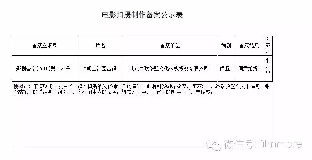近日,国家新闻出版广电总局电影局发布了2016年3月上旬全国电影剧本(梗概)备案、立项公示通知。多部优质小说IP都出现在了本期名单之中,包括历史悬疑题材的《清明上河图密码》、科幻穿越题材的《晋阳三尺雪》等。此外,“建国三部曲”的最后一部《建军大业》也正式立项。