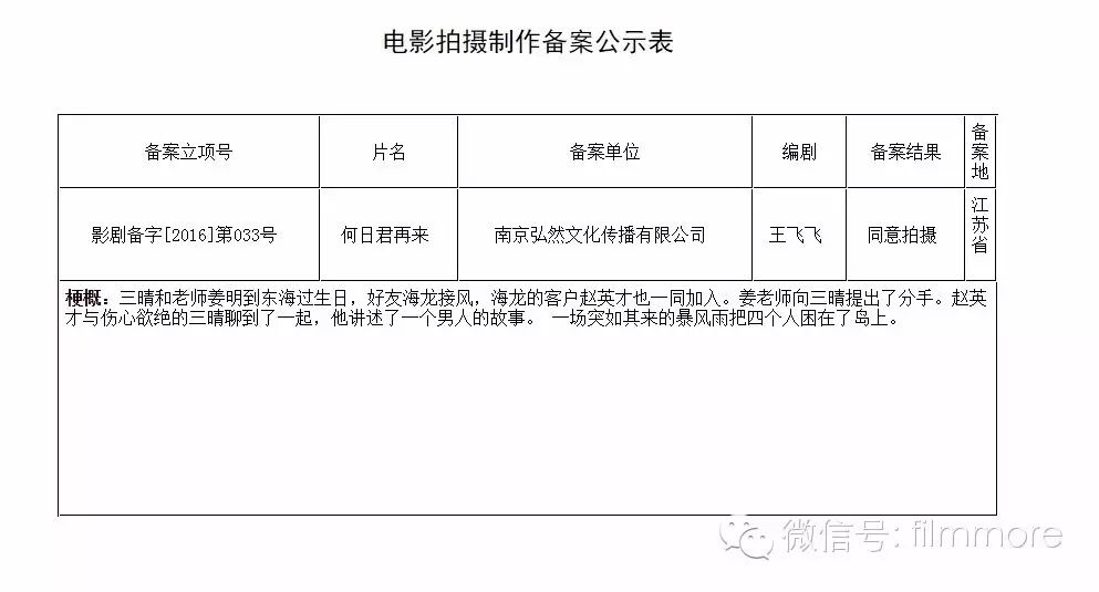 继《同桌的你》、《栀子花开》、《一生有你》等歌曲之后,名曲《何日君再来》也将被搬上大银幕。这首歌的原唱是周璇,此后邓丽君翻唱的版本最被人熟知。从影片的剧情梗概上可以看出,这是一段由师生恋引发的故事。此外,即将在4月1日上映的《不速之客》也正式立项,影片由林大雄执导,黎明、耿乐、韩彩英等人主演,是一部中韩合拍的悬疑犯罪题材电影。