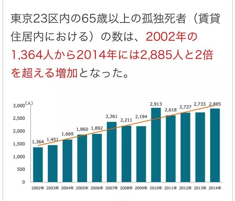 岛国有一项数据统计,说, 目前65岁以上独居的人口大概有600万人,到了2035年,这数据会变成735万人。而近些年来,独居过世的人数是年年在增加的。以东京为例,2002年是1364人,到了2014年,就翻倍到了2885人。