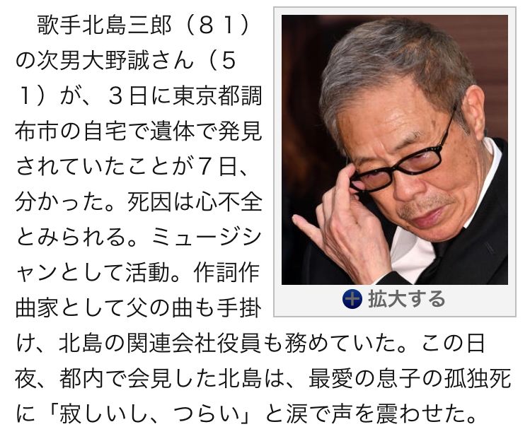 上周有个新闻,一个叫北岛三郎的老歌手(81岁)的二儿子,51岁,突然就去世了,独居。在日本,这种独居人士不为人知地默默去世的情况,叫“孤独死”。唔,没有儿孙绕膝,没有人及时发现并作出妥善的后事安排,想想确实蛮不安的啊。特别是,当我把孤独死三个字输入到GOOGLE里时,蹦出来的图片真的,把我吓傻了(不信你试试)。恩,不想孤独死。