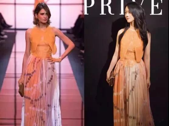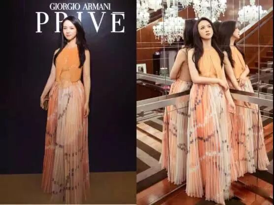一身橘裙的汤唯,出现在Giorgio Armani秋冬系列的高定秀场。