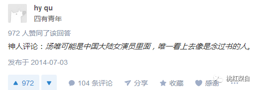 国内女明星普遍演不好文艺青年,但是汤唯可以。有知乎网友毒舌点评:汤唯看起来像是念过书的。