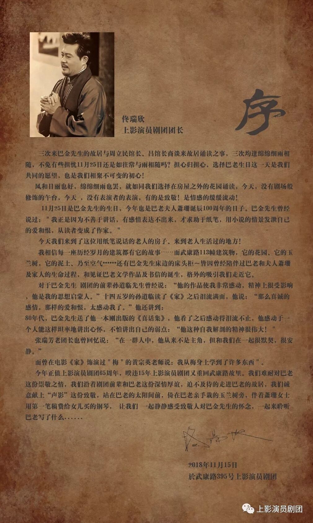 刚刚回归武康路的上影演员剧团的团长佟瑞欣表示,我相信每一座历经岁月的建筑都有它的故事⋯⋯而建筑本身同样也在为文学家,电影人和戏剧人,音乐家,美术创作者们的作品孕育着灵感,提供了空间。而武康路113号这幢建筑物,它的花园、它的玉兰树,它的泥土、乃至空气······还有巴金先生床边的床头柜~阶因曾经陪伴过巴老和夫人萧珊及家人的生命过程,和见证了巴老文学作品及书信的诞生!格外的吸引我们走近它。