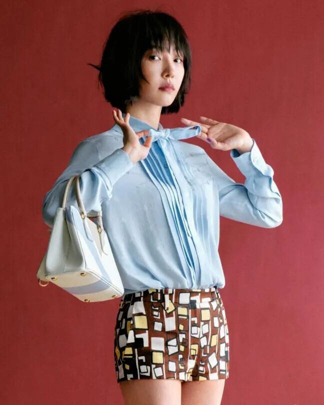 别说原版模特更单薄一条的身形了,她的套裙,无论是挺括的版型、材质还是露腿的款式,怎么折叠身体都能带来视觉的层次感。
