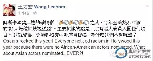 王力宏29日观看完奥斯卡颁奖典礼,大赞今年的活动确实非常精采,也谈到热门的好莱坞种族歧视议题,发现大家都发声为黑人打抱不平,他见了却萌生出另一个疑问:“我就觉得……永远都没有亚洲演员提名……为什么我们不会吭声?”认为这同样是需要大家关注的问题。