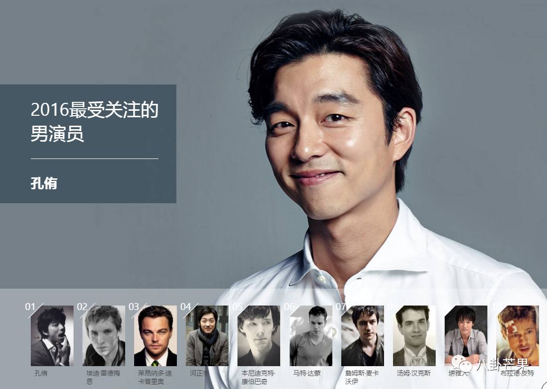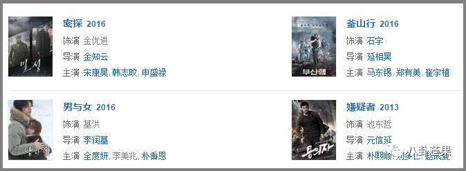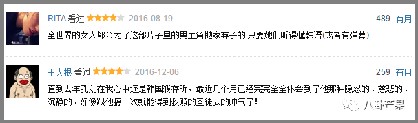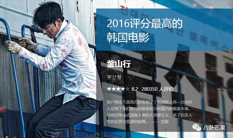 这当然是相应作品支撑起来的,榜单里2016年最高分的韩国电影,就是孔刘的《釜山行》。(芒果也介绍过,戳釜山行)。多一嘴,虽然《釜山行》和《长城》都是典型好莱坞套路的商业片,但《釜山行》里每一个人都有自己的性格和命运,看完不仅仅是爽而已,这很值得学习。