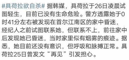 后来经纪人报警,当警察赶到具荷拉家中时,发现她已经昏迷。