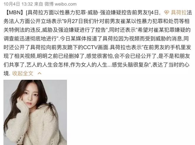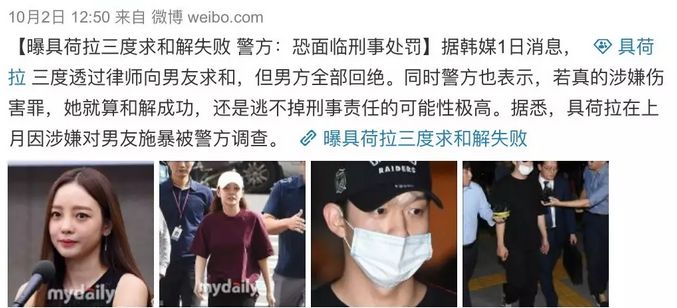 18年9月具荷拉的男友表示自己被具荷拉家暴,还晒了照片证明,
