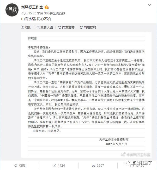 今天的热门头条是蒋劲夫邱欣怡,是卓伟的风行工作室第一时间爆料,不过,该曝料刚刚在网络发酵,风行工作室全体摄影师在今天下午15:03发布了一条辞职信,宣布成立新风行工作室。此辞职信一经发布,很多人就会发问:难道是因为“分赃不均”?