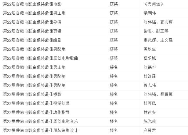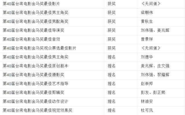 麻烦来看一下《无间道》在金像奖跟金马奖上的提名和获奖记录。