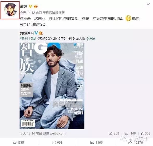 陈坤的新封今天把我给吓到了,这大胡子一时半会儿竟没看出来是谁。。。后来定睛一看,原来是坤哥23333333333